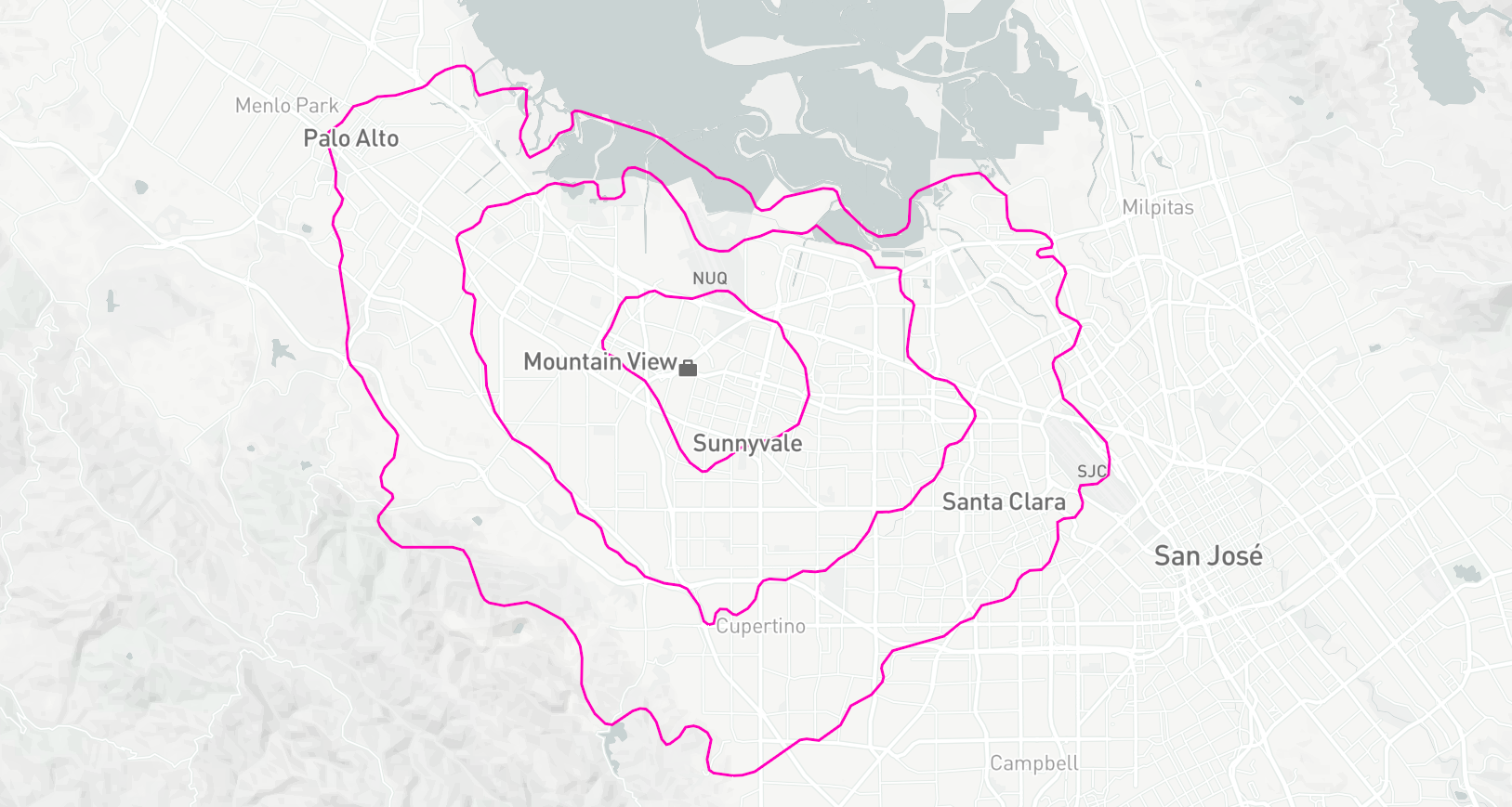 So I put together this map overlaying contours of equal commute time onto the streets and suburbs around Mountain View.
