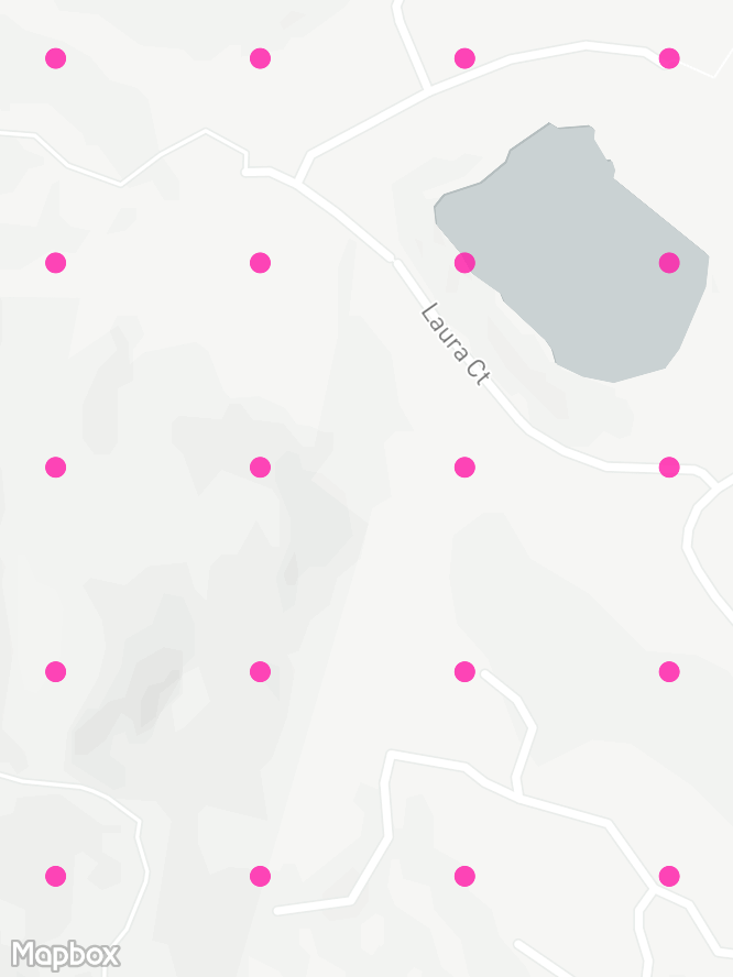 Here's the development of the grid in an area with some forest and a lake. There's a hikers-only trail in the bottom-left that OSRM correctly avoids snapping to, with the rest of the roads and tracks evenly covered by points.