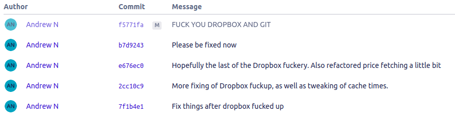After treading unknowingly on thin ice for two years, I learn why you aren’t supposed to keep a git repository in Dropbox. I can’t remember exactly what happened or how I fixed it. I do know there was a lot of swearing in my git commit log around that time.